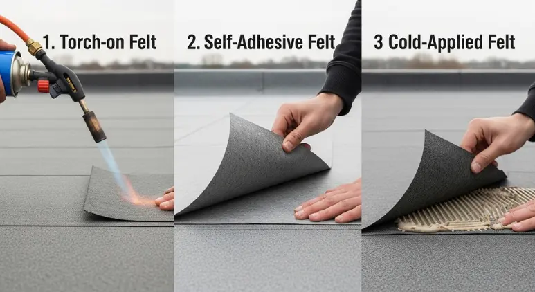 Roofing felt is secured using torch-on bonding, cold adhesive, or self-adhesive systems, with mechanical fixings applied at edges and joints. Correct fixing prevents wind uplift, movement, and water penetration.